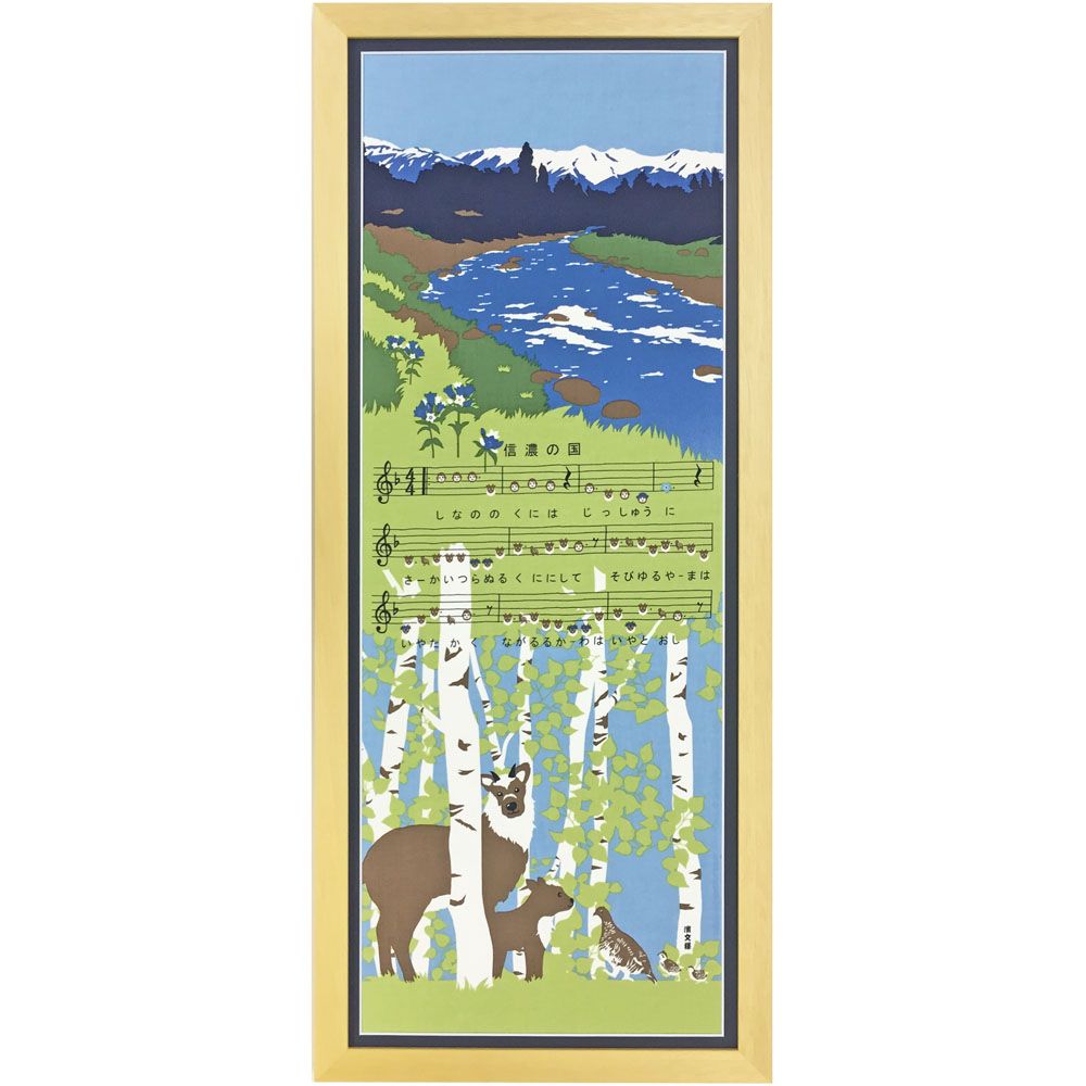 使用した「手ぬぐい額 プレーンフレーム」は、天然木の質感を活かした額縁。自然に恵まれた信州の県歌を飾るのにはぴったりです。