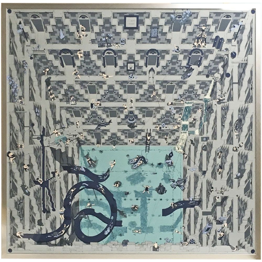 ウーゴ・ガットーニによるデザイン、陽気な雰囲気に包まれたプールのワンシーンが描かれたスカーフです。建物に囲まれた中央にプールがあるイメージでしょうか。整然と描かれた建物と、自由に楽しむ人々の対比が目を引きます。幾何学的ともいえるようなデザインに合わせて、すっきりしたシルバーのフレームを選択しました。建物の色合いとも相まって、統一感のある額装に仕上がっています。