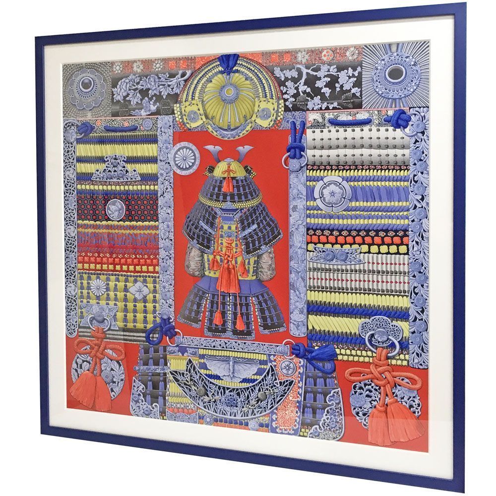 「Parures de Samourais」、大人気のエルメススカーフの額装です。フラットでシンプルなブルーフレームを選択。スカーフの色に合わせたチョイスです。ホワイトマットを組み合わせることで、統一感とメリハリが両立した額装に仕上がっています。