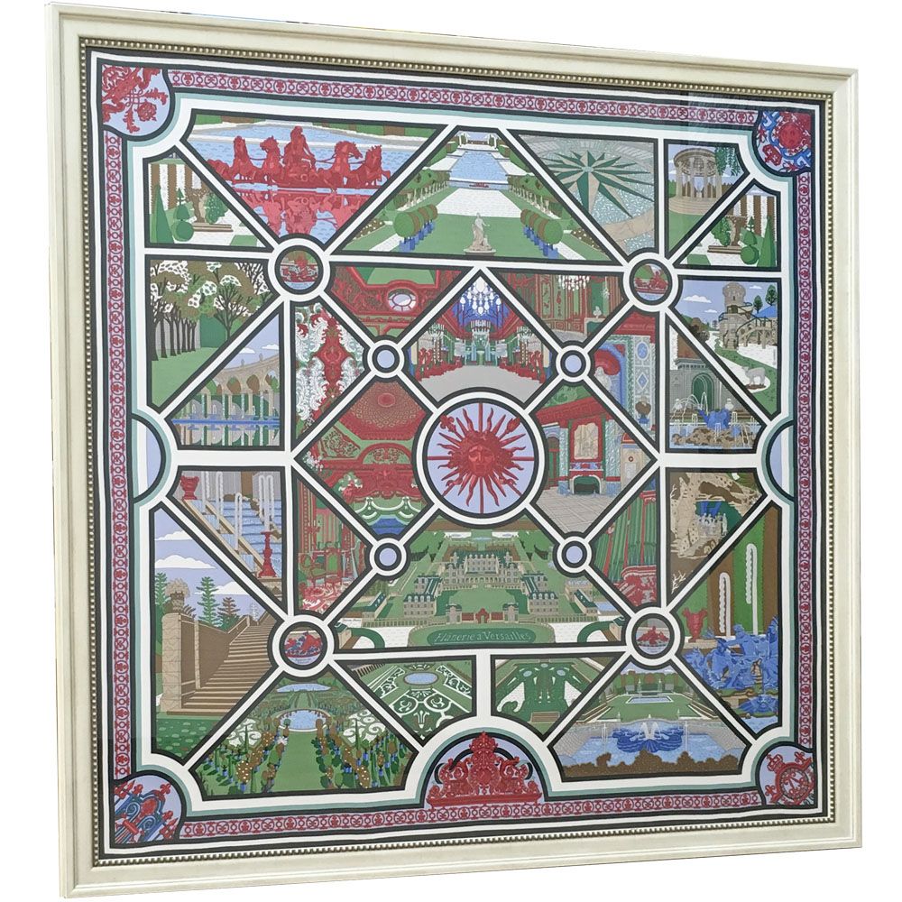 エルメスカレの2016年秋冬コレクション、「ヴェルサイユのそぞろ歩き」の額装です。ヴェルサイユ宮殿の景色を切り取って構築した、ピエール・マリーさんデザインのスカーフ。デザインの一場面ごとにフランスの歴史が見え隠れする、いつまでも驚きと発見が絶えない額装品になることでしょう。