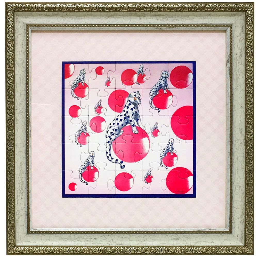 以前こちらと同じ柄のハンカチを額装いたしましたが、今回はジグソーパズルとなります。フランスのジュエリー&時計ブランド、カルティエの商品ノベルティだったのかもしれません。