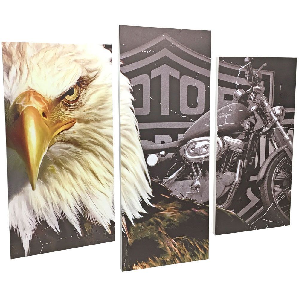 鋭い眼力で見る者を圧倒するハクトウワシは、ご存じハーレーダビッドソンのシンボルになります。メインである鷲の背後に隠れるバイクとロゴとの色彩差が、それぞれの存在を主張しつつ引き立てあっています。
