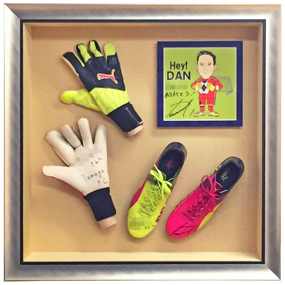 Jリーグの松本山雅、シュミット・ダニエル選手のサイン入りグローブとシューズの額装です。選手の似顔絵イラストもお入れして、目を惹く額装品となりました。