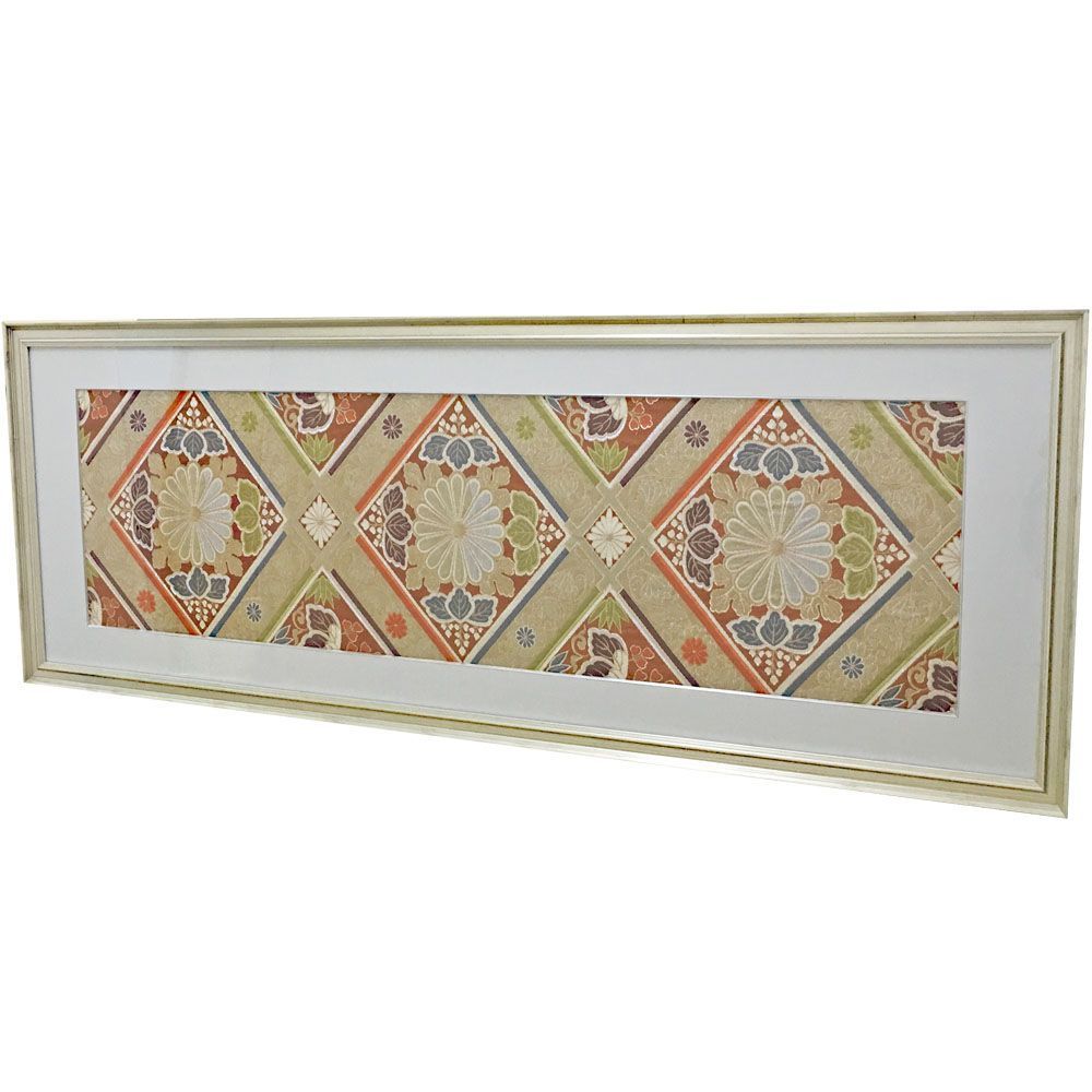 美しい模様が繰り返される帯地。飾る壁面の横幅が2.4m程度ということで、およそ1200程度の横幅で額縁をお作りしました。絵柄の繰り返しとしては3つ分で調整しています。帯地自体は3m以上にもなるので、繰り返しのデザインの帯地なら、さらに細長く仕上げることも可能です。壁面に目一杯だと窮屈になるので、額縁の左右に適度な余白は確保しましょう。机上ではなかなか適正な余白をイメージするのは困難ですが、額縁無しの帯地を壁にぶら下げるなど、現場で実際に動いてみるとイメージしやすいかと思います。