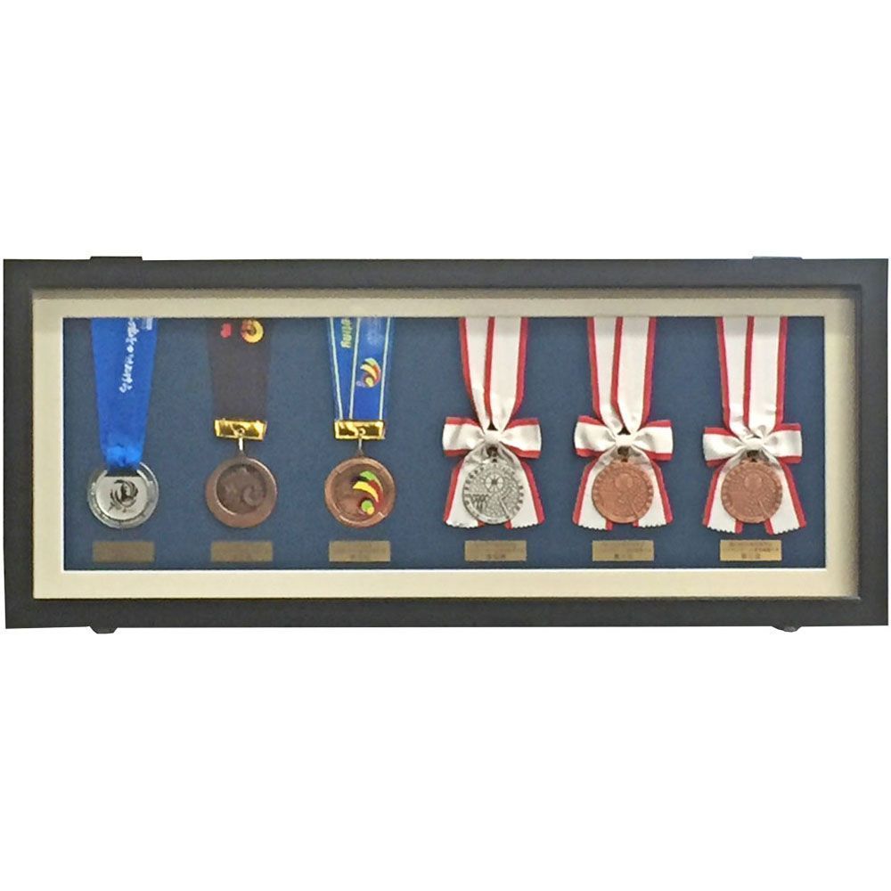 今までもリボン付きのメダルを額装してきましたが、こちらの額は開閉式です。お写真でもわかるように、下から開けることが可能になっています。