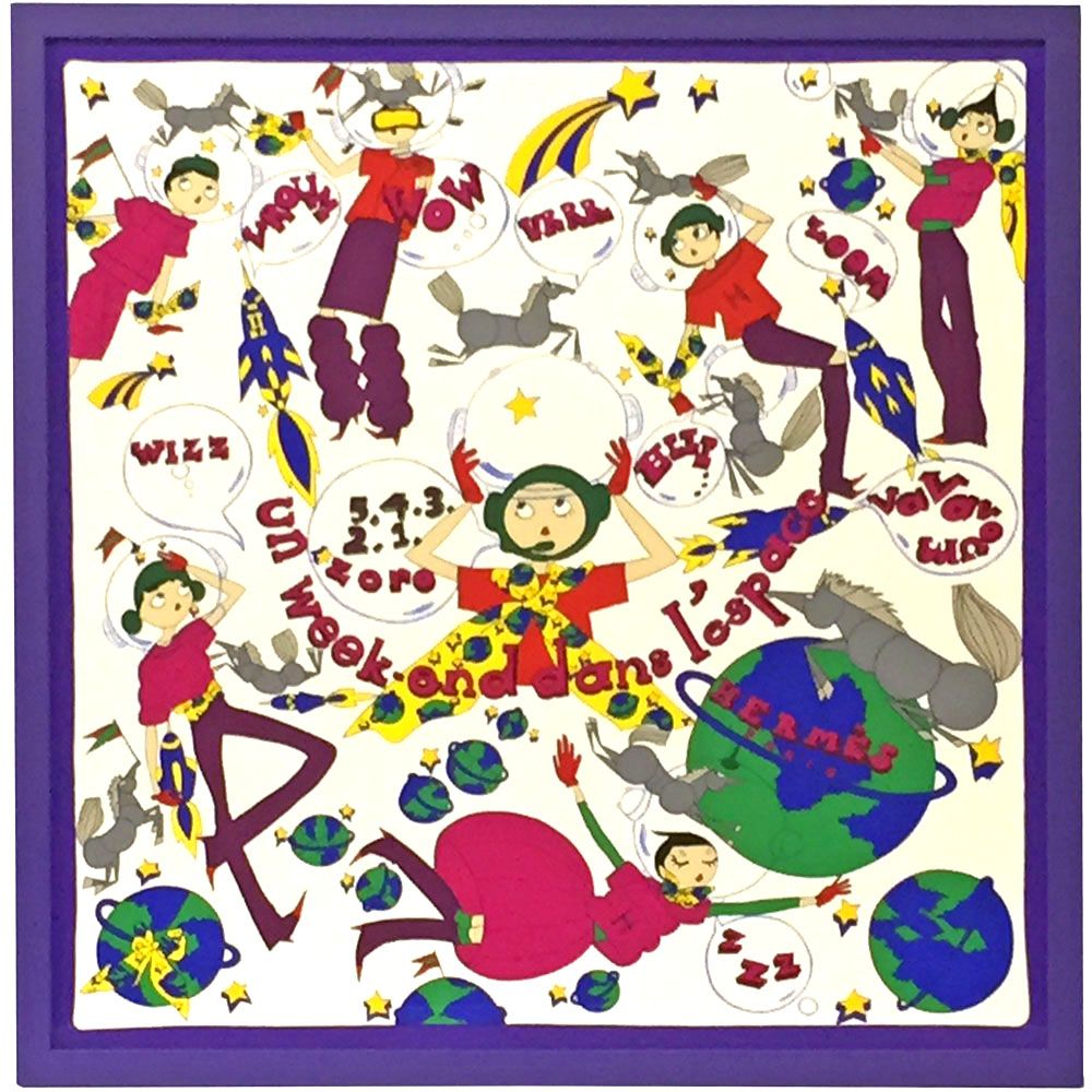 2015年のエルメス秋冬コレクションで発表されたスカーフ、Un Week-End dans l'Espace(気ままな週末)の額装です。標準的な90cmのスカーフに比べると、若干コンパクトな70cm弱のスカーフですが、お部屋の主役になりえるインパクトは変わりません。 スカーフ周囲の紫と、ほぼ同色の額縁を合わせました。紫一色のシンプルなフレームで、まるでスカーフと同化したような仕上がりになっています。額縁のタカハシでは700-800種のフレームをご用意しておりますが、ここまで色合いが揃うことはまれです。中身に合わせて色を塗り直すといったことはできないので、額縁と中身の色が揃うのはちょっとしたレアケース。運良く同色に近いフレームが見つかったら、採用を検討しても良いかもしれません。とはいえ、同色のフレームにこだわると選択肢が狭まってしまうのも事実です。基本的に額縁を選択する際は、凝り固まったイメージに囚われべきではありません。