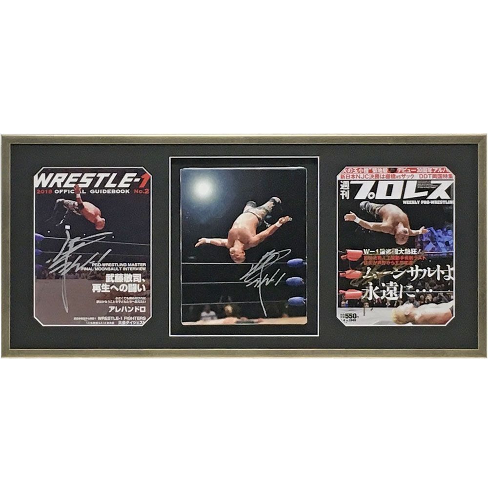 プロレスラー武藤敬司さんの、サイン入りの雑誌とポートレートを一緒に額縁にお入れしました。こちらの雑誌を飾る表紙は、2018年3月に行われた試合にて、人生最後の「ムーンサルトプレス」で勝利した時の写真です。ファンの方々には大変思い入れのある試合になったようです。