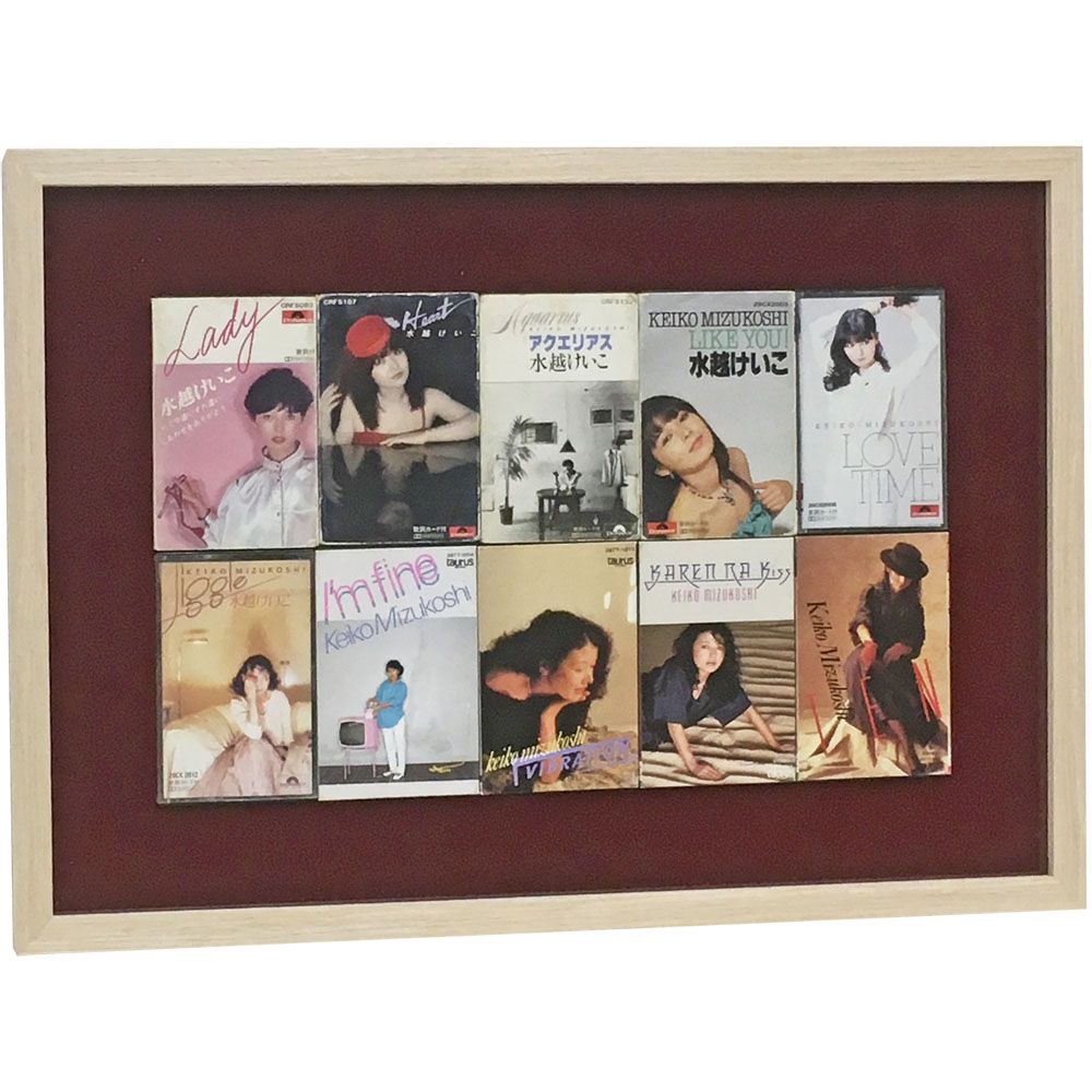 懐かしのカセットテープの額装です。カセットテープよりも旧時代的な、レコードが一部で復活の兆しを見せている中、カセットテープはレコード以上にレトロなアイテムと言えるかもしれません。定額制で聴き放題のサービスが盛り上がりを見せていますが、ほんの一昔前までは、好きな曲を聴くにはレコードやカセットテープ、もしくはCDを物理的に持つしかありませんでした。お気に入りの歌手がいれば、ラジカセやコンポの傍らにずらずらとシングルやアルバムが並ぶのが必然です。