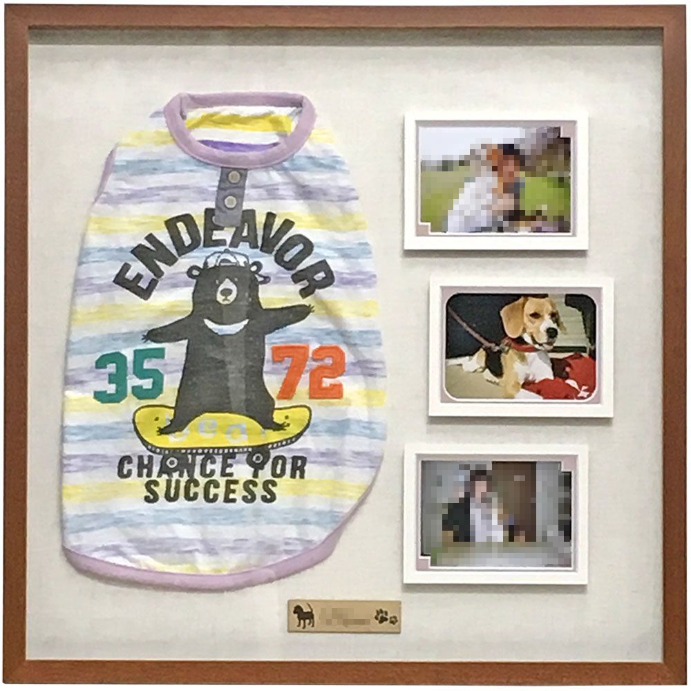 結婚式のお二人の間にもその姿を確認できるほど、まさに家族の一員であった愛犬。天寿を全うし、残されたドッグウェアをお写真と共に額装しました。愛称とシルエットを添えた彫刻プレートもレイアウトしています。額縁内部に深さの確保された立体額を用意し、ふんわりとしたドッグウェアの質感を活かしつつ、額装マットで枠を付けたお写真をランダムに配置しました。ドッグウェア以外にも、首輪やリードなどを額装しても良いでしょう。