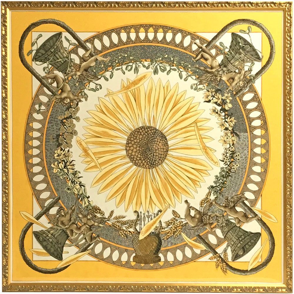 こちらはエルメスのカレ「amours(アモーレ)」です。中心の大きなひまわりと共に天使と鐘がデザインされています。ひまわりの他にも百合や麦などといった様々な草花が散りばめられている、華やかなスカーフです。