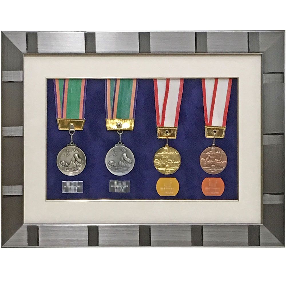 しまいこまれていた水泳大会のメダルに日の目を当てたいということで、4つのメダルを一つの額縁にコンパクトにまとめました。賞状などは飾らずメダルのみの額装です。メダルの裏に添付されたプレートを剥がして配置しましたので、賞状が無くとも大会名などが分かります。