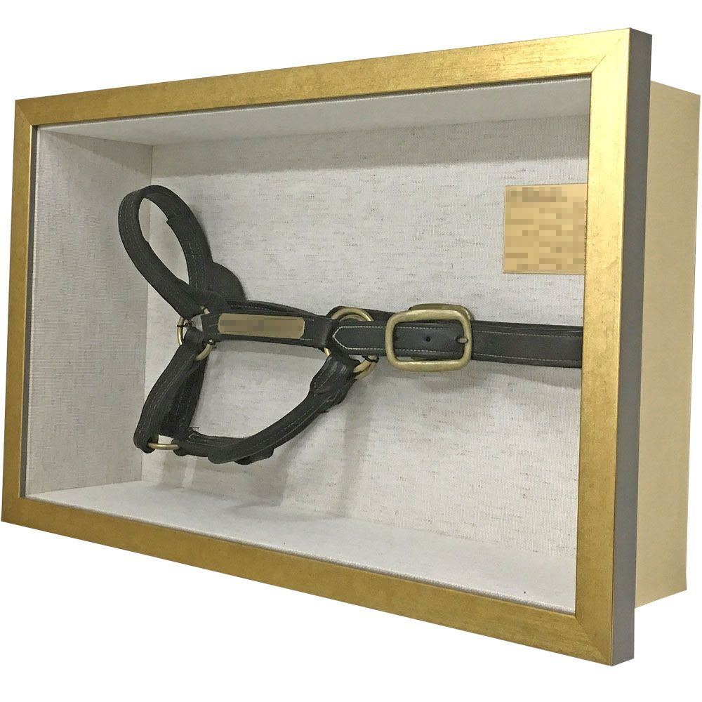 額縁のタカハシは古今東西全ての品物を額縁に飾るべく、日々の業務に邁進しておりますが、頭絡の額装は初めてでした。不定形の品物ですので、縦横深さに余裕を持った額縁を用意し、額縁の中央に頭絡を固定しています。命に関わる馬具ですから、丈夫で重量も嵩みがちです。額縁背面に穴を開け、丈夫な糸を通して縛って額装しています。血統などを説明する、金の彫刻プレートも添えました。