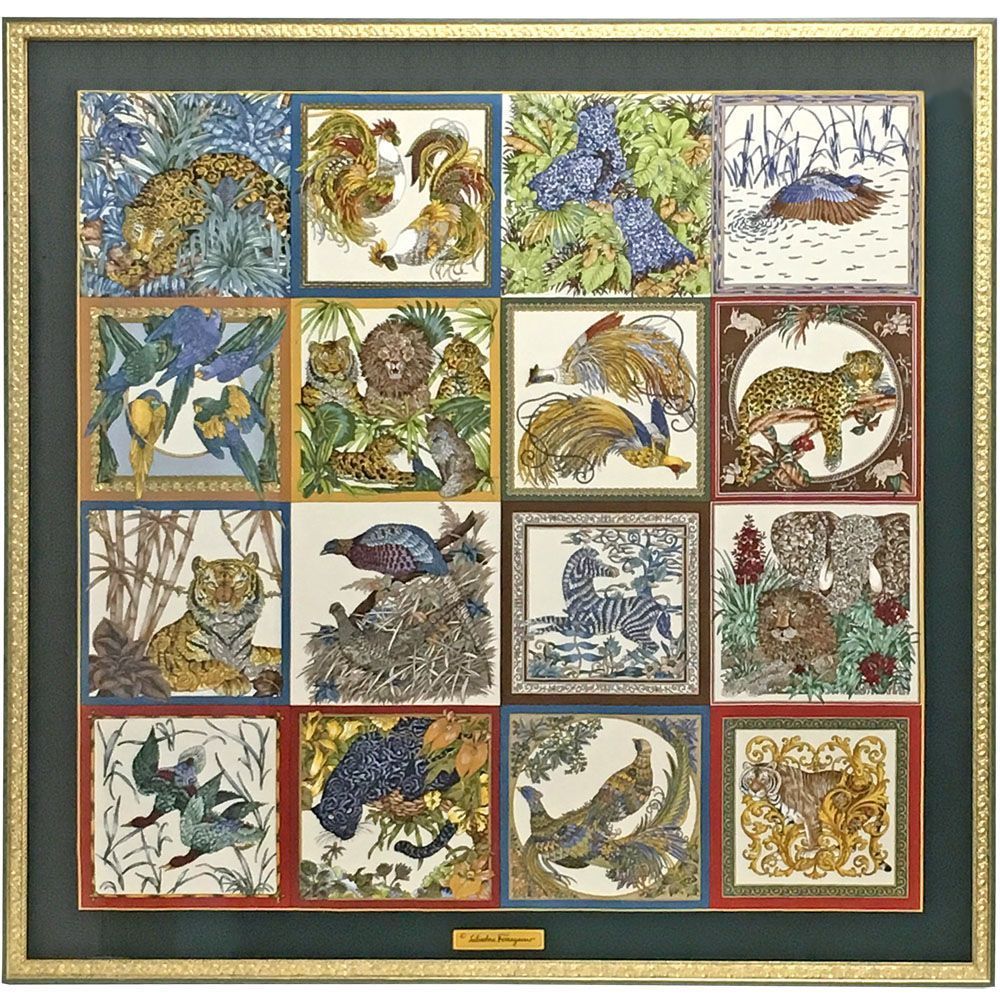 様々な動物があしらわれたフェラガモのスカーフです。正確に分けられた升目の中に、自然な姿の動物が描かれています。升目の周囲には無地の黒地部分が確保されており、まるで額装マットを組み合わせたような見た目になりました。