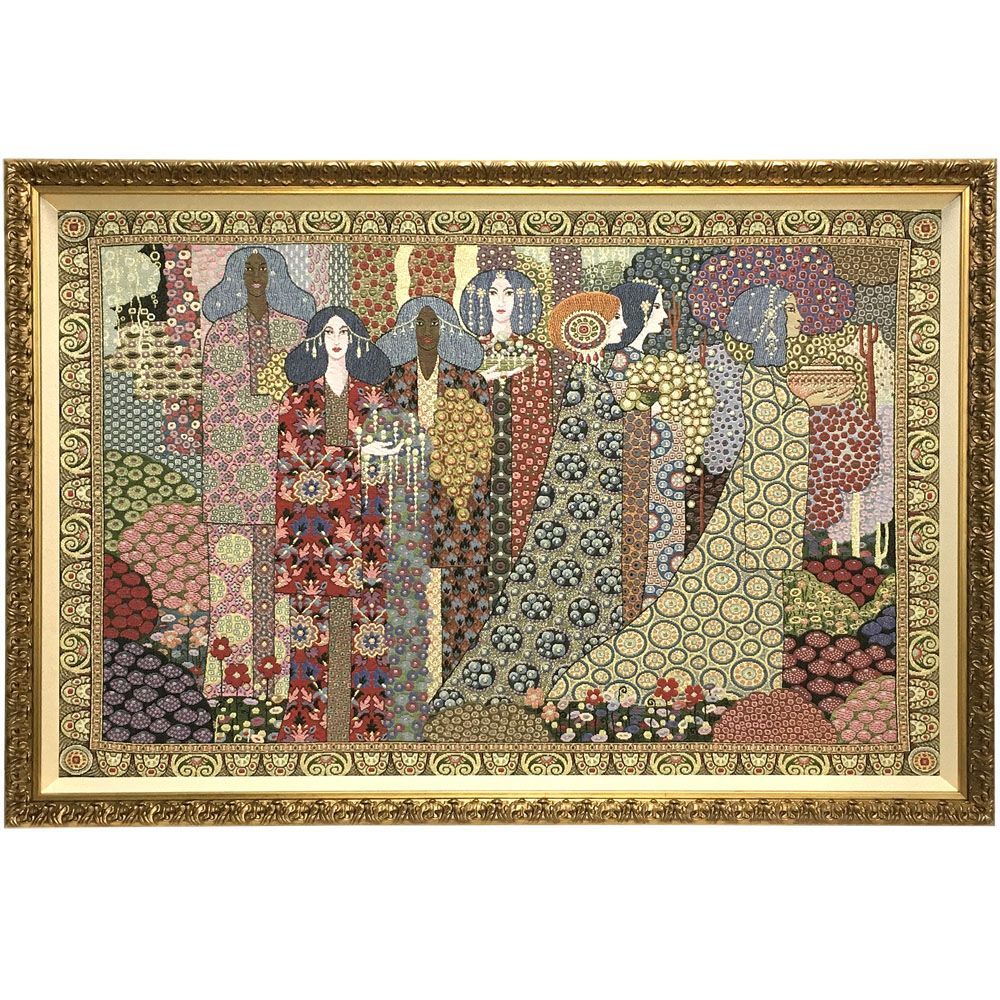 ファッションショーの場面を切り取ったような、デザイン性の高さに目を見張るゴブラン織りの額装です。ゴブラン織りは太目の糸で、ざっくりとした大まかなイメージを表現する印象がありますが、こちらの作品の絵柄は非常に精緻。人物の表情、衣装、背景、周囲の模様など、筆舌に尽くしがたい一品です。