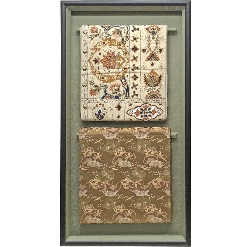似た仕様の「着物の帯地専用額」を商品化して販売しておりますので、そちらもご参照ください。 着物の帯は3.5メートルほどとかなり長め。こちらの額装例では、2種類の帯地をおよそ35cmの正方形程度の大きさで見せています。帯地のカットはしていないので、幾重にも畳まれた帯地がぶら下がっていることになります。
