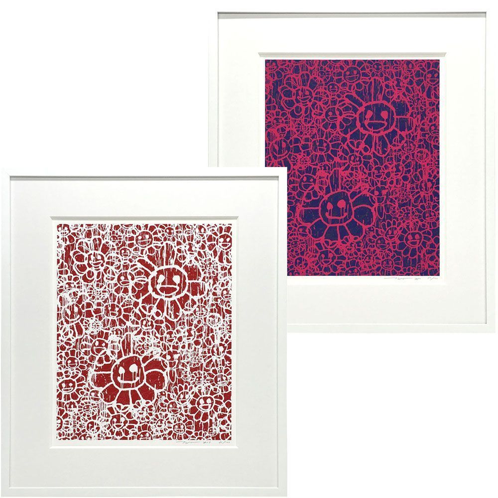 「MURAKAMI×MADSAKI」村上隆とマッドサキのコラボレーション作品の額装です。長年ニューヨークで活動し、近年は東京に創作のベースを移して活動するMADSAKI(マッドサキ)。挑発的で皮肉っぽい彼の作風に、村上隆の代表作・フラワーズはうってつけの題材ではないでしょうか。にっこにこのお花たちが、退廃的なカラーリングとタッチで表現されています。可愛らしさと不気味さが、絶妙に同居したバランス感覚が見事です。