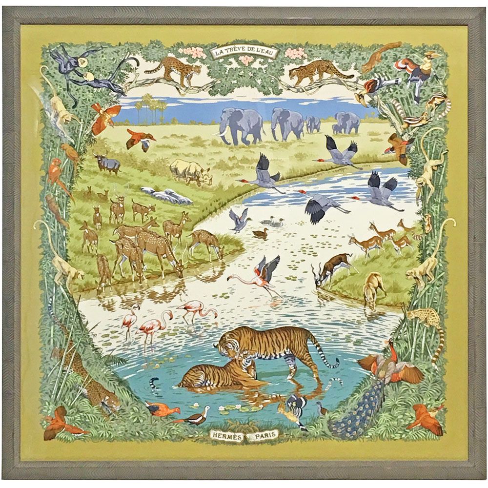 LA TREVE DE LEAU(水の休戦)と名付けられた、エルメス・カレの額装です。色とりどり、様々な動物たちが描かれたスカーフは、楽しげで見ていて飽きません。繊細なシルクの布地に表現された、躍動感溢れる動物たち。エルメスならではの素晴らしいスカーフです。 ブロンズ色のアンティークフレームを選択。サバンナの野性味溢れる雰囲気と良く合っています。金属のような木材のような、はたまた石材のような微妙な色合いのフレームですが、材質自体はれっきとした木材(パイン材)です。ブロンズ調のアンティーク塗装で、魅力的な色合いと質感が再現されています。 額縁を構成するフレームは、主にヨーロッパ、アジア、日本国内等で作られます。形状・塗装まで仕上げられたフレームは、棹材もしくはモールディングと呼ばれ、額縁に組み上げられるのを待つことになります。日本ではあまり馴染みがありませんが、モールディングは室内の装飾に使われることもあるようです。 額縁のタカハシでは、700種類にも及ぶモールディングを取り扱っております。お客様のご希望に適う、あなただけの額縁を見つけてください。