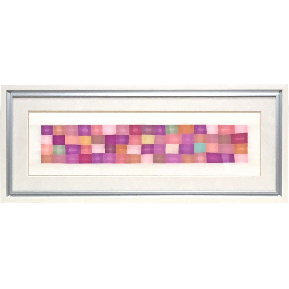小さなパッチワークの額装です。3cm位の小さな布地が、縫い付けられてカラフルな模様を描き出しています。袋状の2重になった品物でしたが、表地だけ切り分けて額装しました。