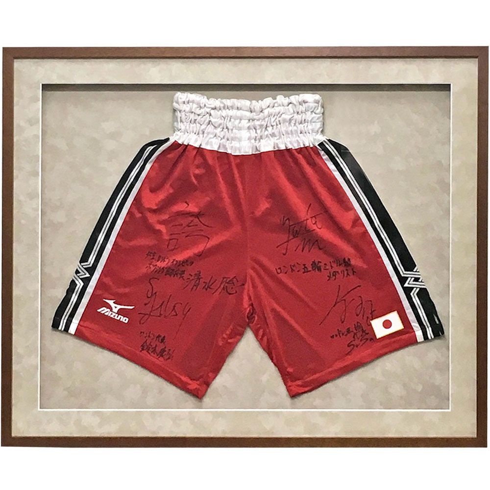 たくさんのサインが入った、ボクシングトランクスの額装です。ナチュラルな木地色のフレームと、アイボリー色の布マットでコーディネートしました。自然な色合いの中に、トランクスの赤が鮮やかに映えています。