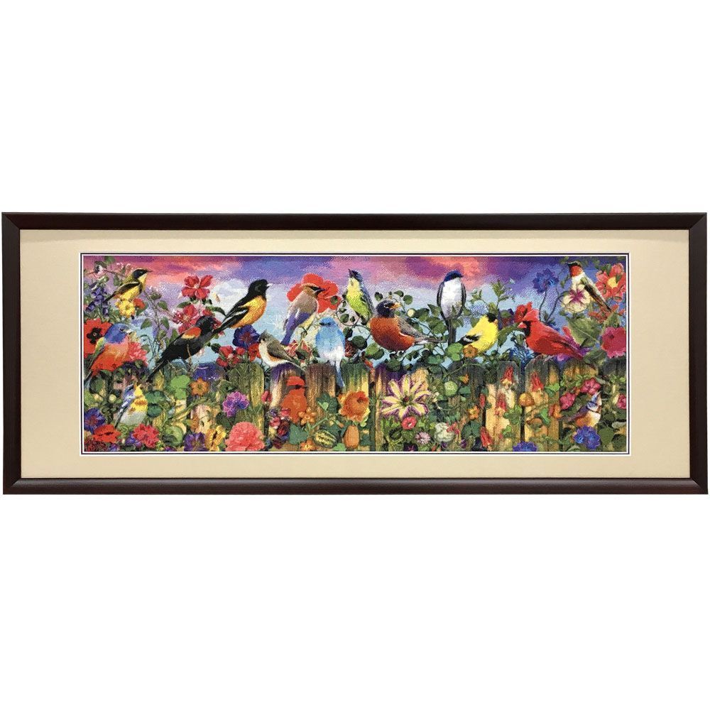 手ぬぐい額を利用したクロスステッチの額装です。横長のパノラマ画面に色とりどりのカラフルな鳥たちが描かれています。一体何色の刺繍糸が使われているのでしょうか。完成まで1年半の力作ということです。