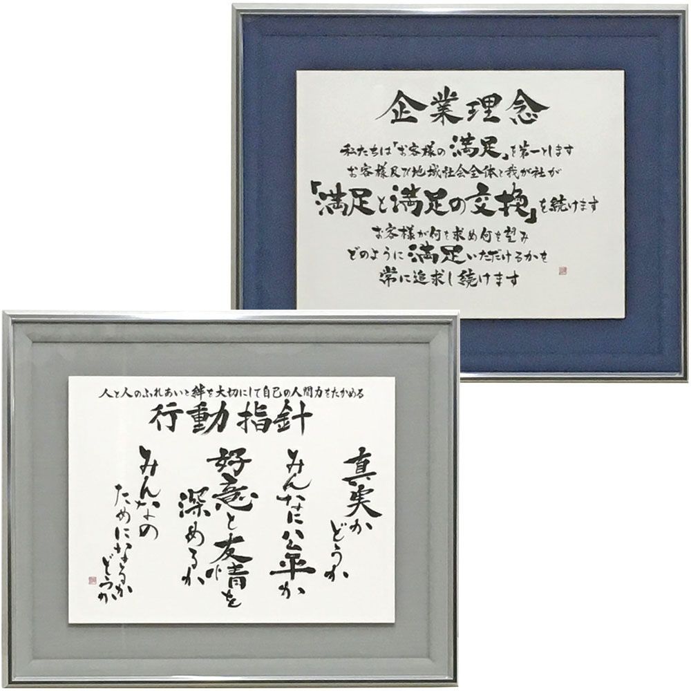 企業理念と行動指針の書道作品の額装です。企業が成長する原動力となる企業理念や行動指針は、なるべく目に付く場所に飾っておきたいもの。やはり墨で書かれた作品には力があるので、単純にプリントアウトした文章とは一味違います。後述する裏打ち作業等も含め、自社工場で一貫対応いたしますので、企業理念などの額装は是非当社にお任せください。