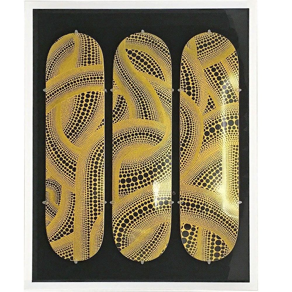 草間彌生の「YELLOW TREES」が再現されたスケートボードの額装