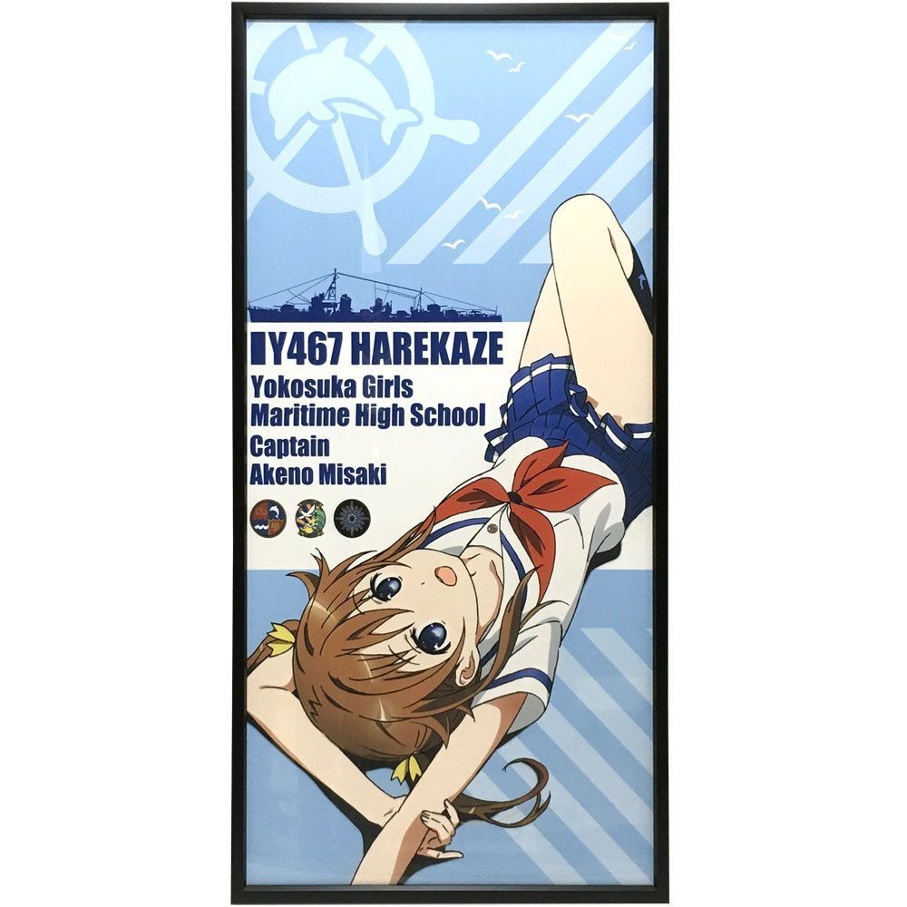 プロダクションアイムズ制作、アニメ「ハイスクール・フリート」の主人公、岬明乃のマルチクロスの額装です。武蔵、比叡など、多数の艦船が登場する「ハイスクール・フリート」。ブラック一色のアルミ製・シンプルなフレームが、艦船のイメージとマッチしました。ポップな絵柄と黒のフレームが対比され、メリハリのある仕上がりになっています。