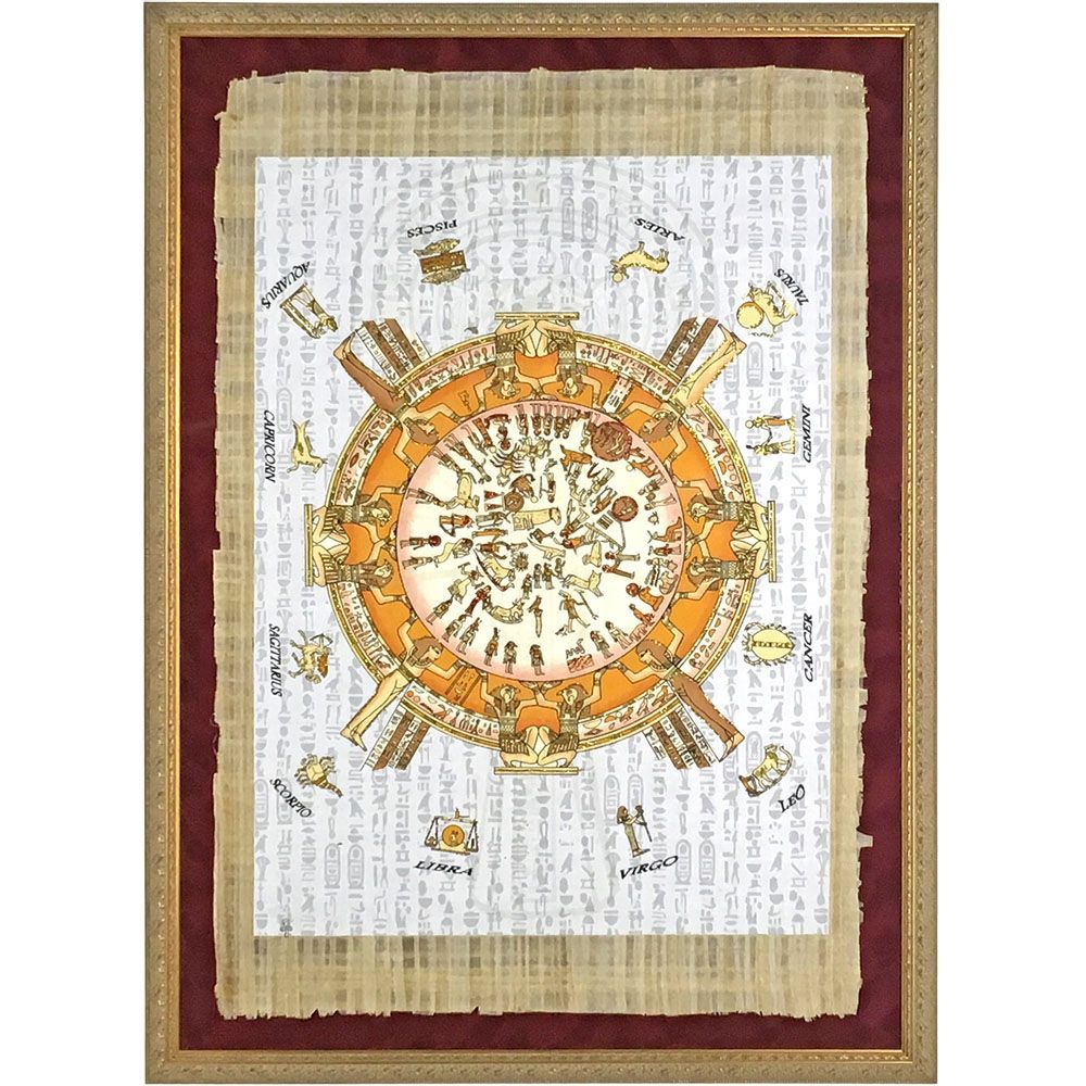 縦が100cm近い大きなパピルスです。エジプト神話の神や、黄道十二星座が描かれています。中心の円を支えているのは、エジプトでは天空と太陽を司っているという神ホルスです。