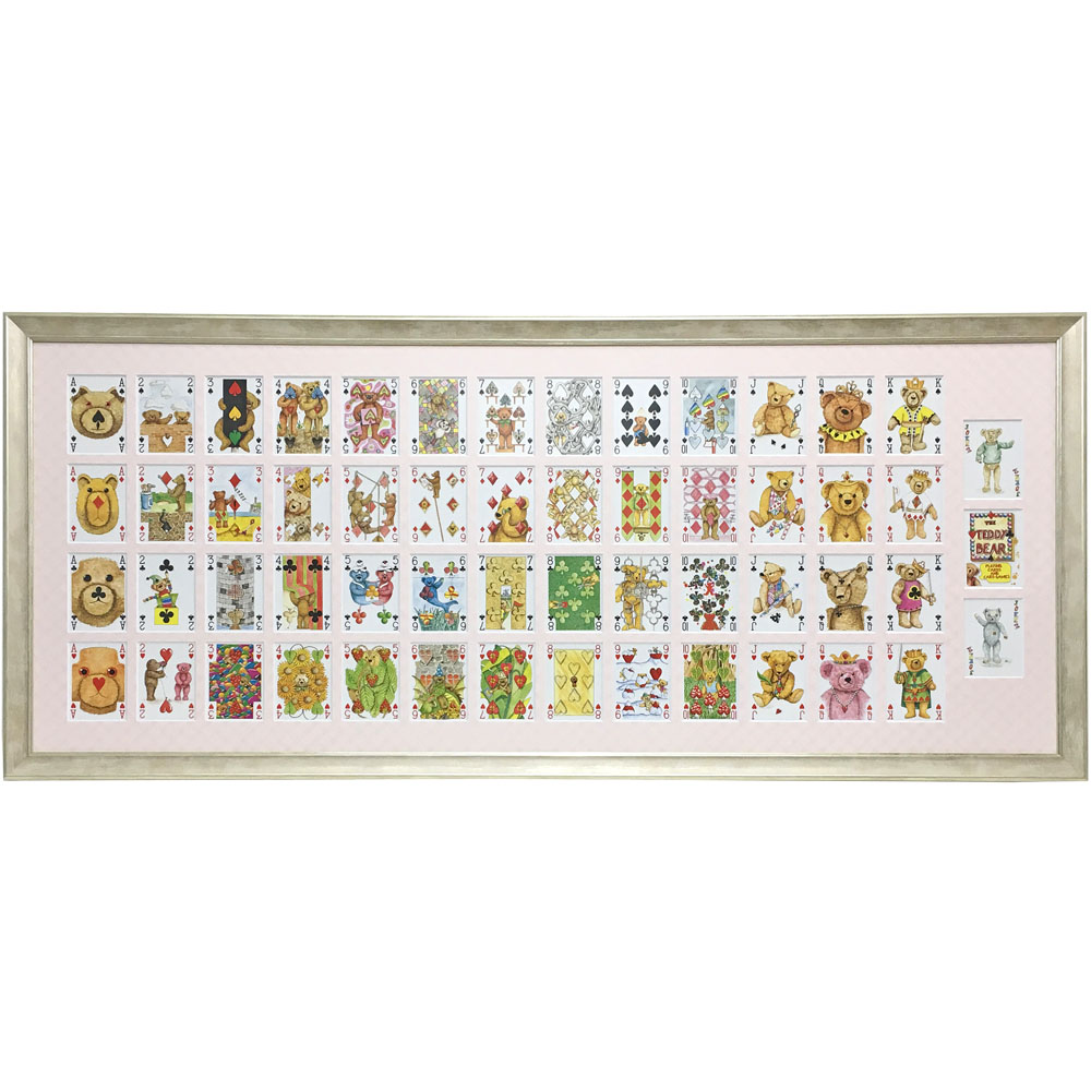 可愛らしいテディベアの絵柄のトランプです。全カード55枚を複数窓抜きでご用意しました。額縁の左からエース~キングまで、上からスペード・ダイヤ・クローバー・ハートを並べています。