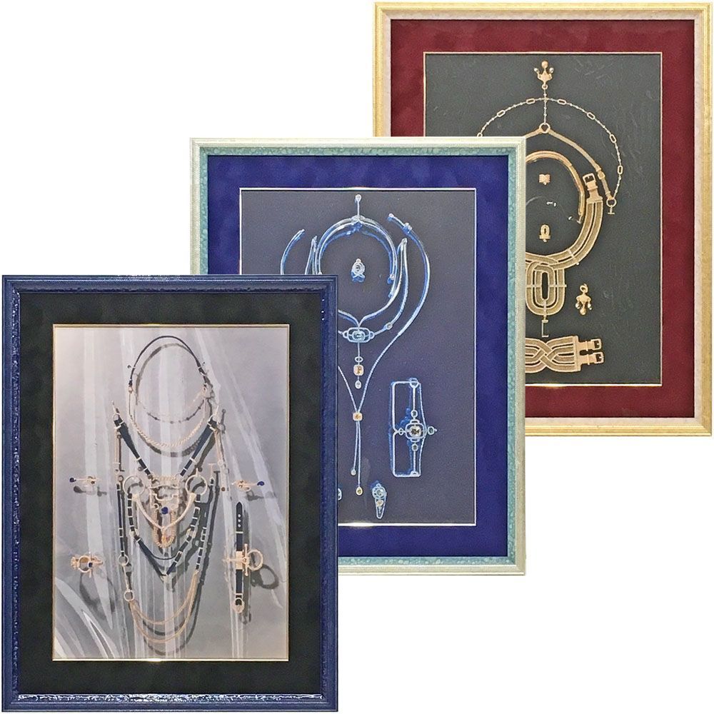 エルメスが手掛けるジュエリー「ブリッド・ドゥ・ガラ」・「グラン・アバラ」・「デッラ・カヴァッレリア」三種類のポスターです。馬具からデザインされた独創的なジュエリーのデッサンのようです。