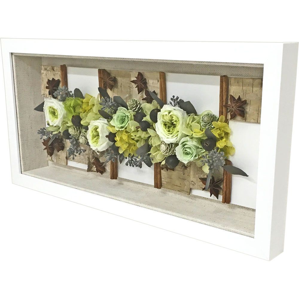 緑と白を基調とした作品に合わせて「14-UH2030WH」のホワイトフレームで製作しました。内部に貼ったざっくりとした麻の布地が、ナチュラルな雰囲気で作品に良く馴染んでいます。