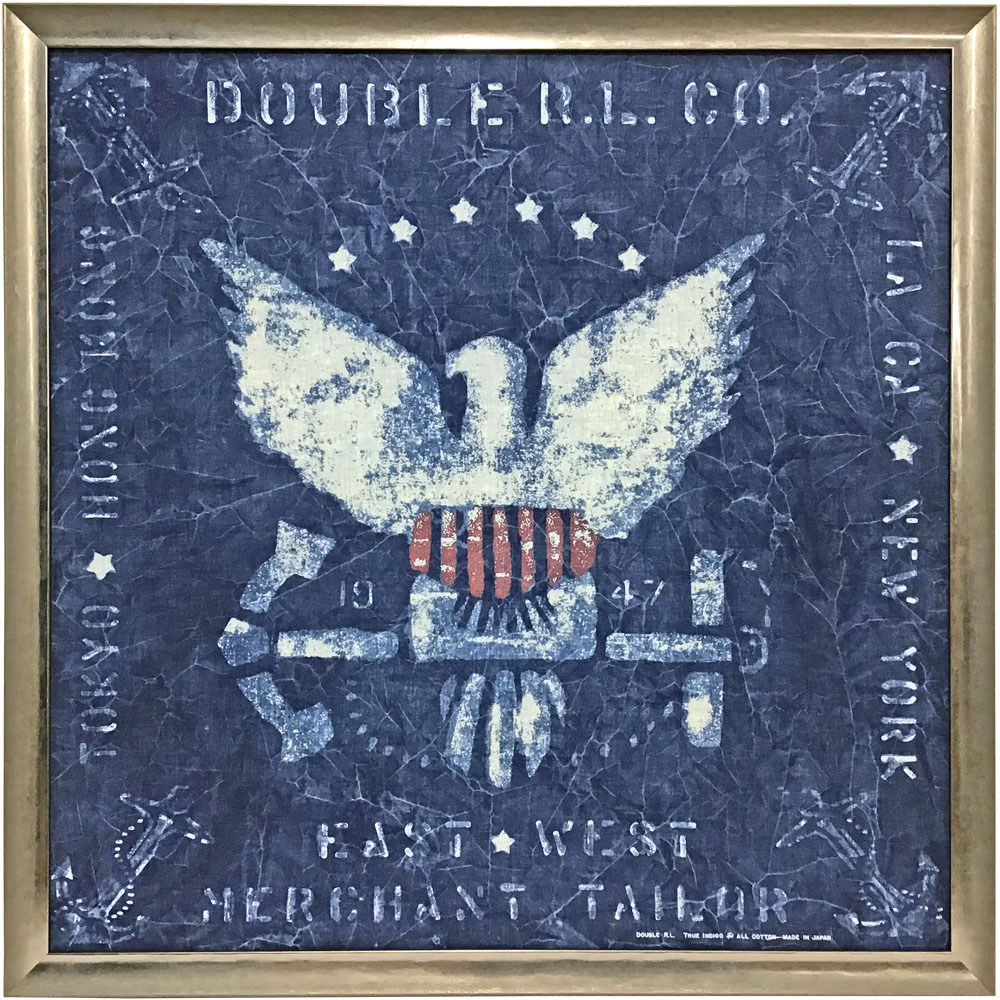 ラルフローレン氏のブランド、RRL(ダブルアールエル)のインディゴ染めのバンダナになります。スカーフと同じように額装しました。シルクとコットンの違いはありますが、布地をそのまま額縁に飾ることはできません。皺伸ばしや張り込みを行い、布地をピシッと固定させてから額装する必要があります。こちらのようなバンダナの他、風呂敷などもスカーフと同じ工程で額装が可能です。