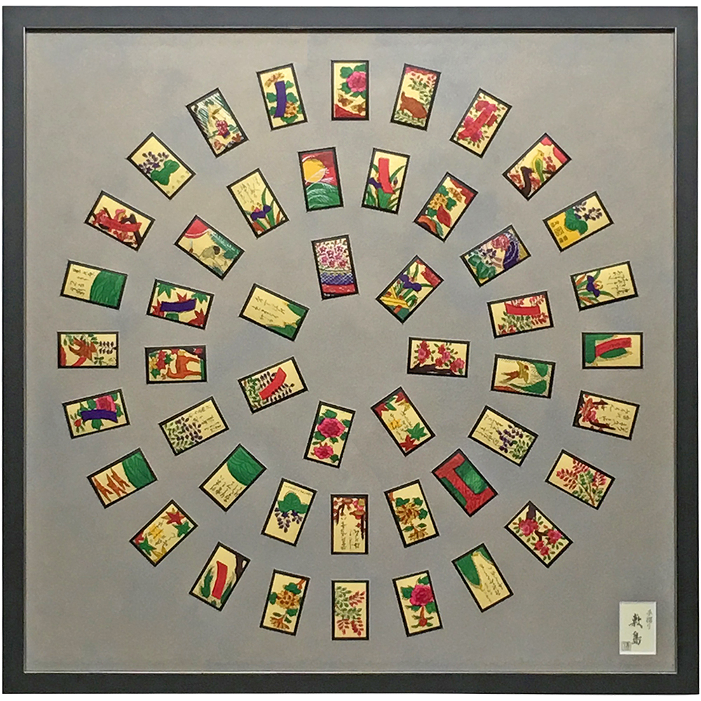 60cmの正方形の額縁に、らせん状に散りばめた花札が目を引く額装です。全48枚の花札とブランド名の敷島を合わせて、計49ヶの窓抜きを施しました。マットカッターの窓抜きレイアウトの入力に非常に時間が掛かります。円形に自動で振り分けるような仕組みは備わっていないので、位置や角度を手入力で調整しました。