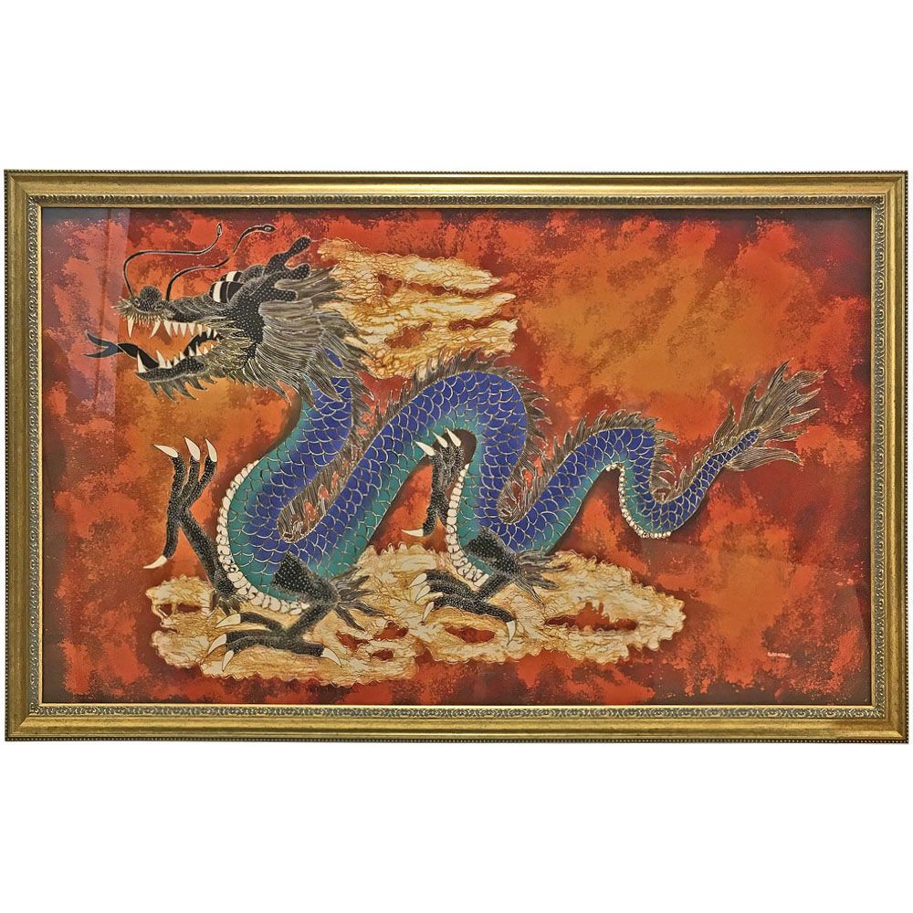 ロウケツ染めをオーダーフレームで額装しました。東南アジアからのお土産に多いロウケツ染め。こちらはインドネシアでお求めになられたということです。縁起がよさそうな、堂々たるドラゴンが描かれています。