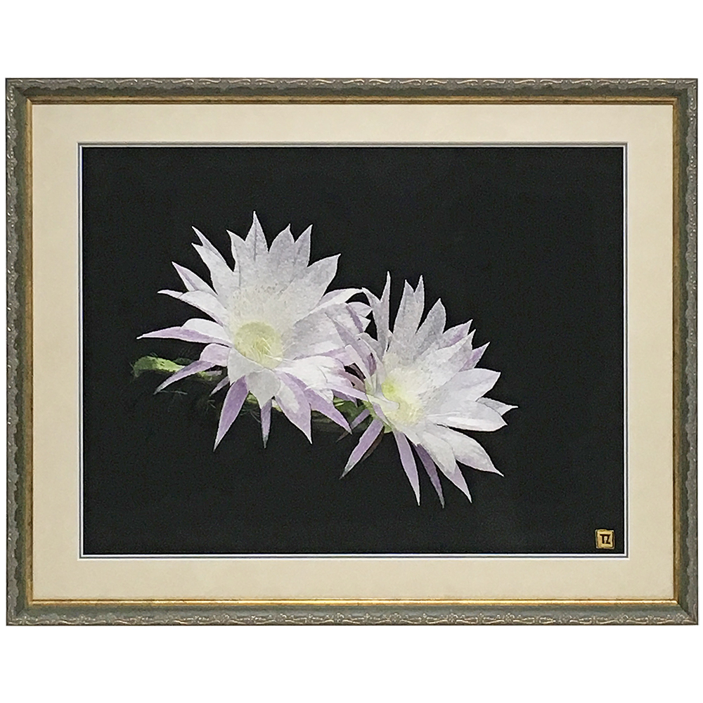 夜間だけ花開く月下美人の通り、黒地の中に月下美人が浮かんでいます。額装例の写真よりも、黒地部分がさらに広く確保されていましたが、マットの下に黒地部分を隠して寸法調整を行いました。