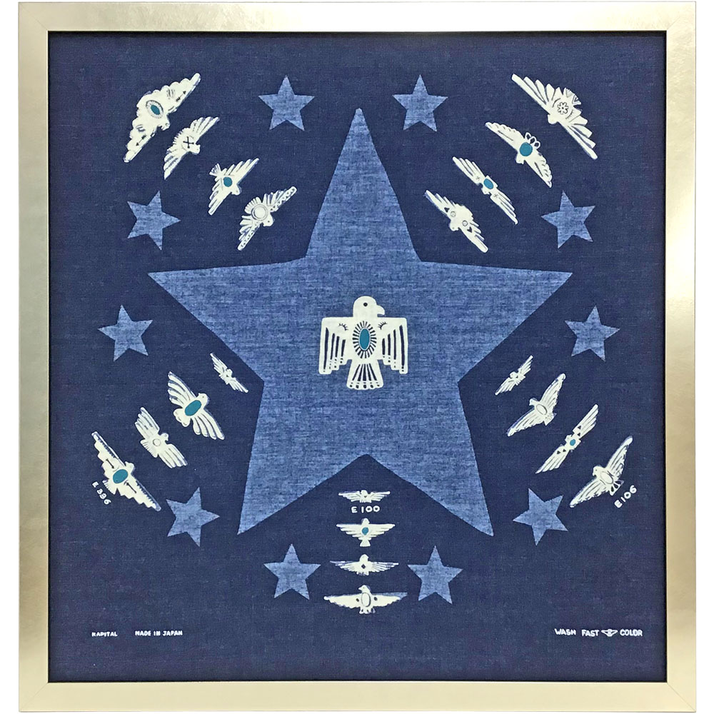 50cm程度の小ぶりなバンダナの額装です。遠目から見て、あれは何かな?と近づいてみたくなるデザイン。誰もが親しみやすい星型の中に、古代文明のアクセサリーのようなキャラクターが配置されていて、愛らしくも謎めいた雰囲気です。