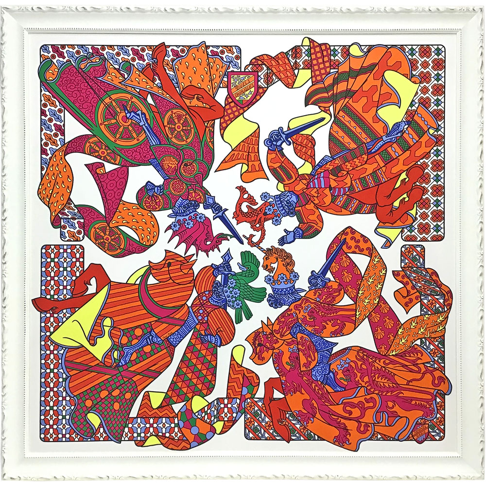 エルメスのカレ「夢見る決闘(duels oniriques)」を額装いたしました。デザイナーはピエール・マリー。エルメスが所持する古書、15世紀の紋章図鑑の図像をモデルに、4人の騎士たちの戦いを描いたものです。現代的な鮮やかな色合いが絶妙で、色違いのスカーフも数多く発売されています。