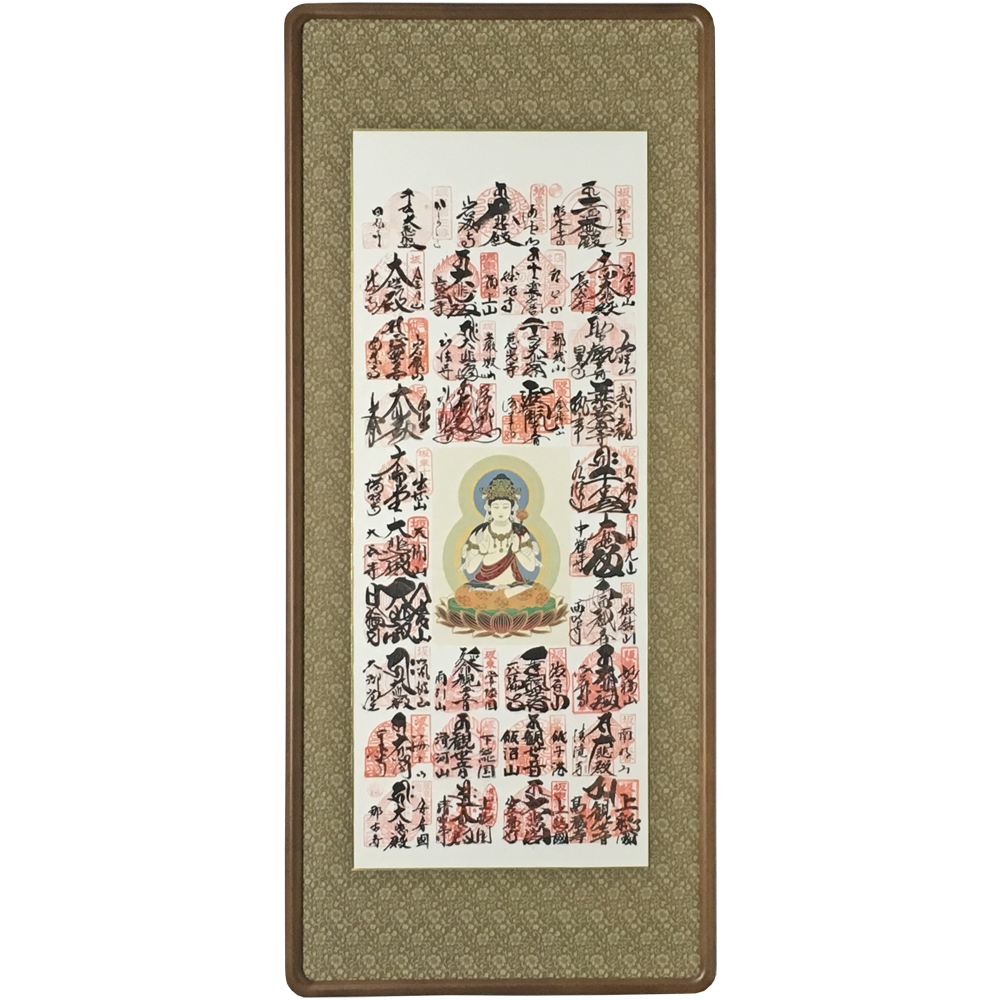 以前にもこちらと同様の「坂東三十三観音霊場」の額装を承っております。額縁のサイズや布地の色が異なる額装となっておりますので、比較してご覧になってみてください。以前の額装例では、横幅を若干コンパクトに仕上げています。