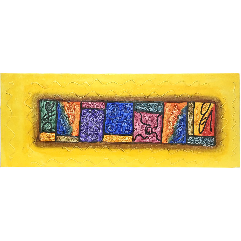 フレームがないのでアクリルなどの表面カバーを付けることはできませんが、作品そのものの風合い、質感を全面的に押し出して飾ることができます。こちらの作品は、まるで黄色地の中心に描かれたモチーフが浮き上がっているようにみえます。自然と中心に視線が集まるためか、パネル側面に若干見えている、キャンバスの地色もあまり気になりません。