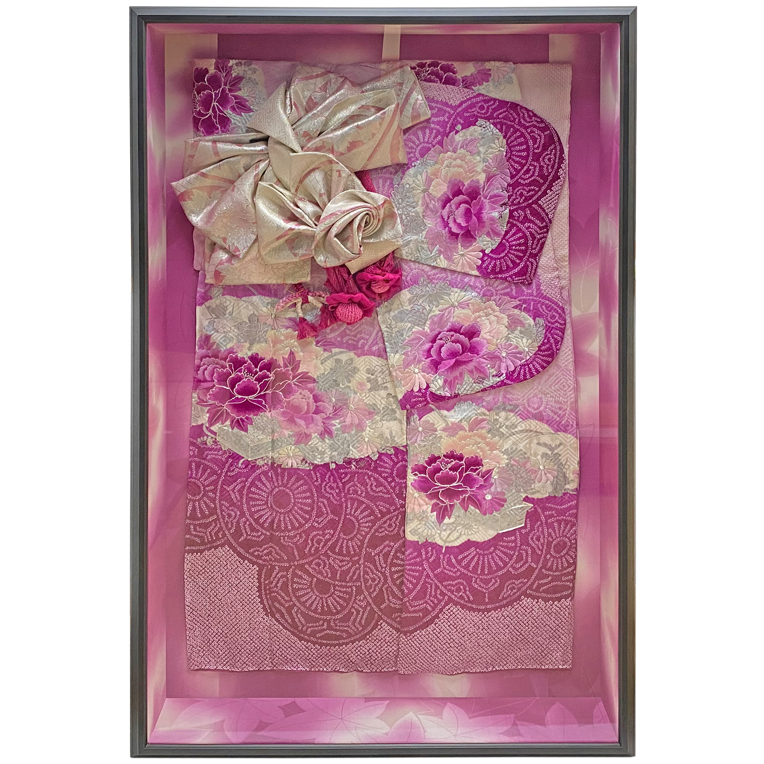 着物・帯地・帯紐を、立体額の全体にレイアウトしました。