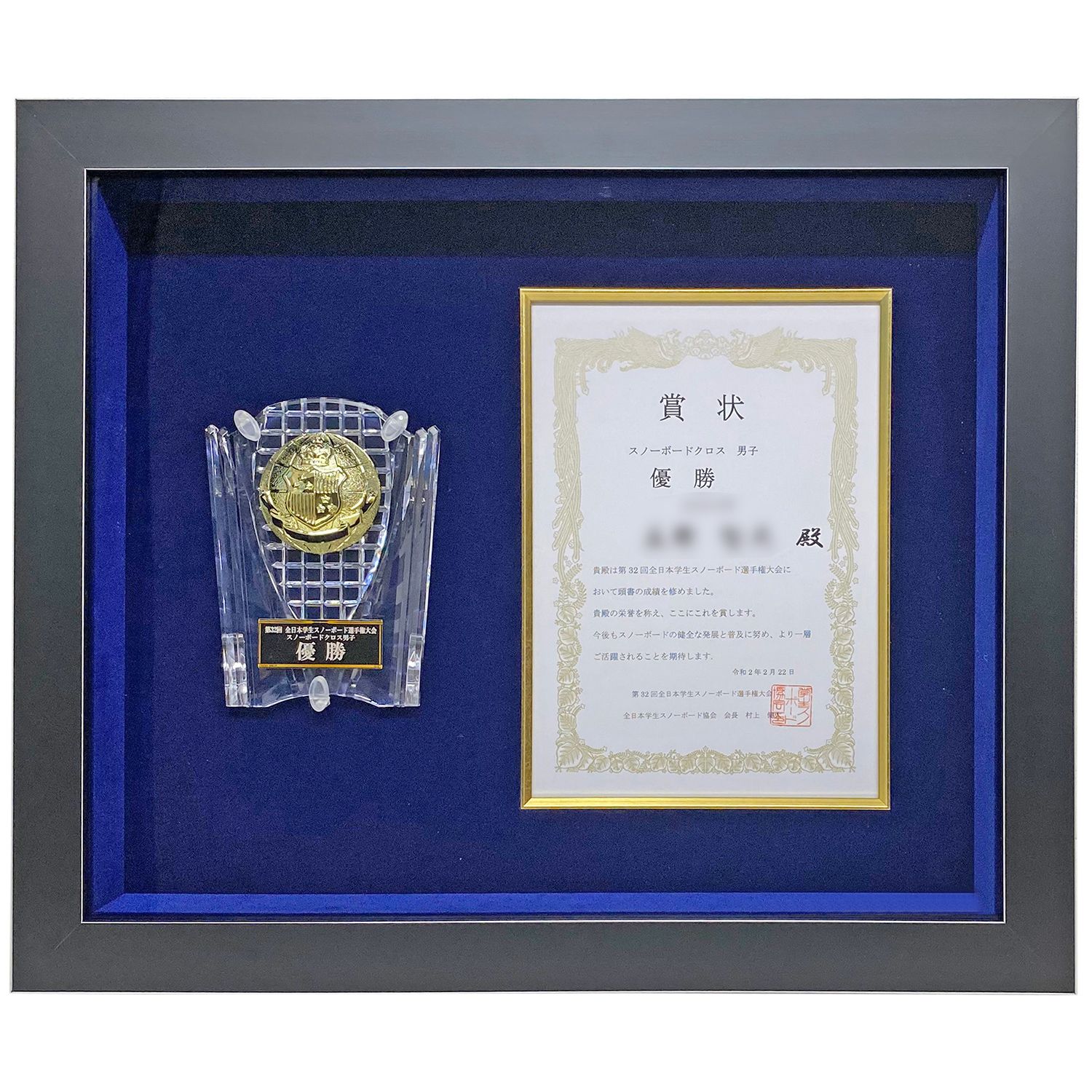 全日本学生スノーボード選手権大会、スノーボードクロス競技で見事優勝を飾った表彰状とクリスタル楯の額装です。艶消しのブラックにシルバーラインが映える、シャープな印象のB-10153のフレームと、スエード紺の布地がよく合いました。
