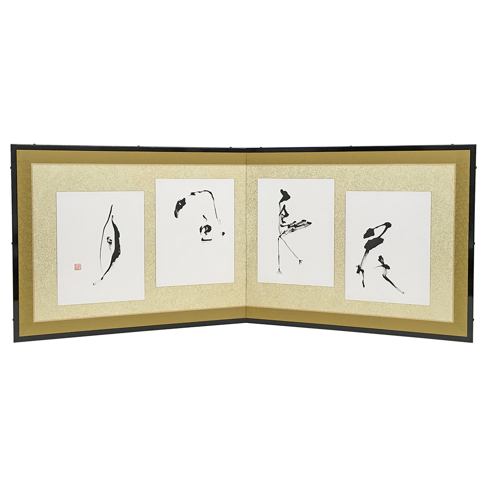 4点連作の書道作品「花鳥風月」を、2曲屏風仕立てにしました。作品の1枚1枚は半切1/3(348×455)サイズでしたが、張り込みにあたって330×430ミリに断ち落としを行い、金色の覆輪を付けて屏風に張り込んでいます。4枚の張り込み位置に高低差を付けることで、動きのある仕上がりになりました。