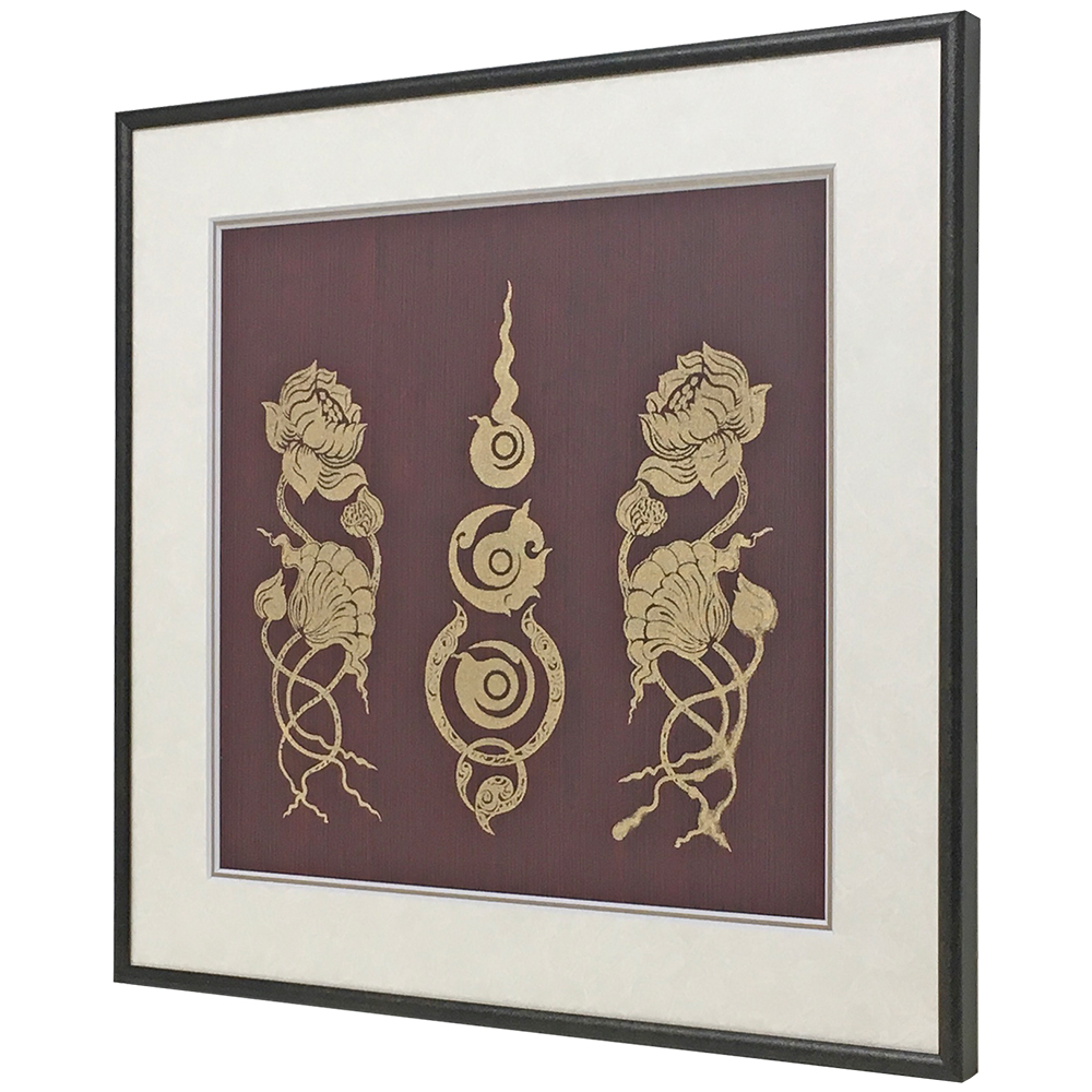 タイ旅行で求めたタイシルクの刺繍作品です。臙脂色の布地に金糸が美しく輝いています。作品のいわれはわかりませんが、宗教的、神秘的な雰囲気が感じられる作品。