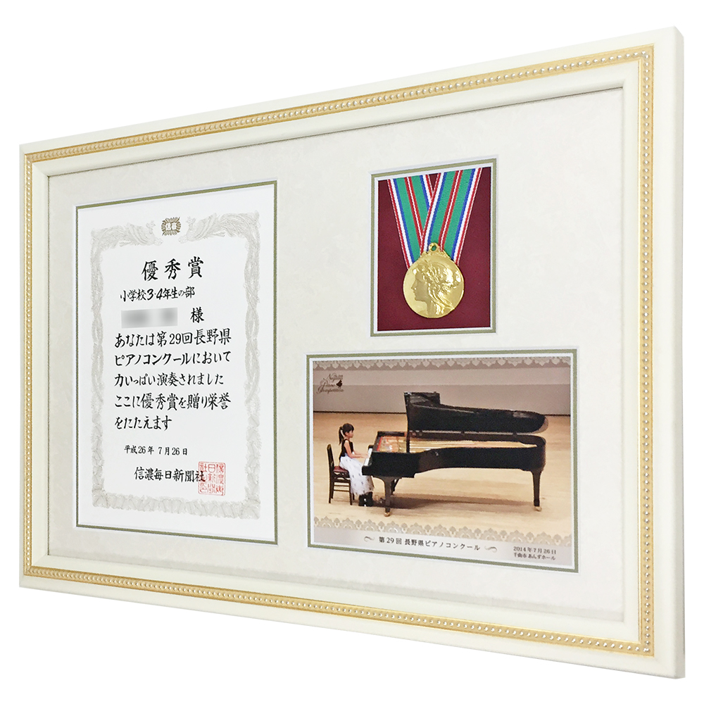 ピアノコンクールで優秀賞を受賞した時の記念の賞状とメダル、演奏している写真を一緒に飾りました。副賞としていただくことも多いお写真は、当時の想い出が鮮明に思い出される一品です。こういったお写真に限らず、賞状を額縁に飾るなら、少し欲張っていろいろな物を一緒に飾ってはいかがでしょうか。品物の数だけ、よりリアルな思い出がいつまでも残ります。