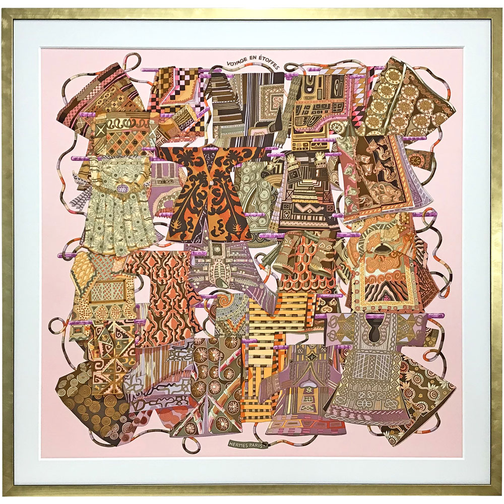 エルメスの90cmサイズのスカーフの額装です。土地ごとの様々な衣装が描かれたスカーフは、美しさとともに民俗学的な知識欲も刺激されます。