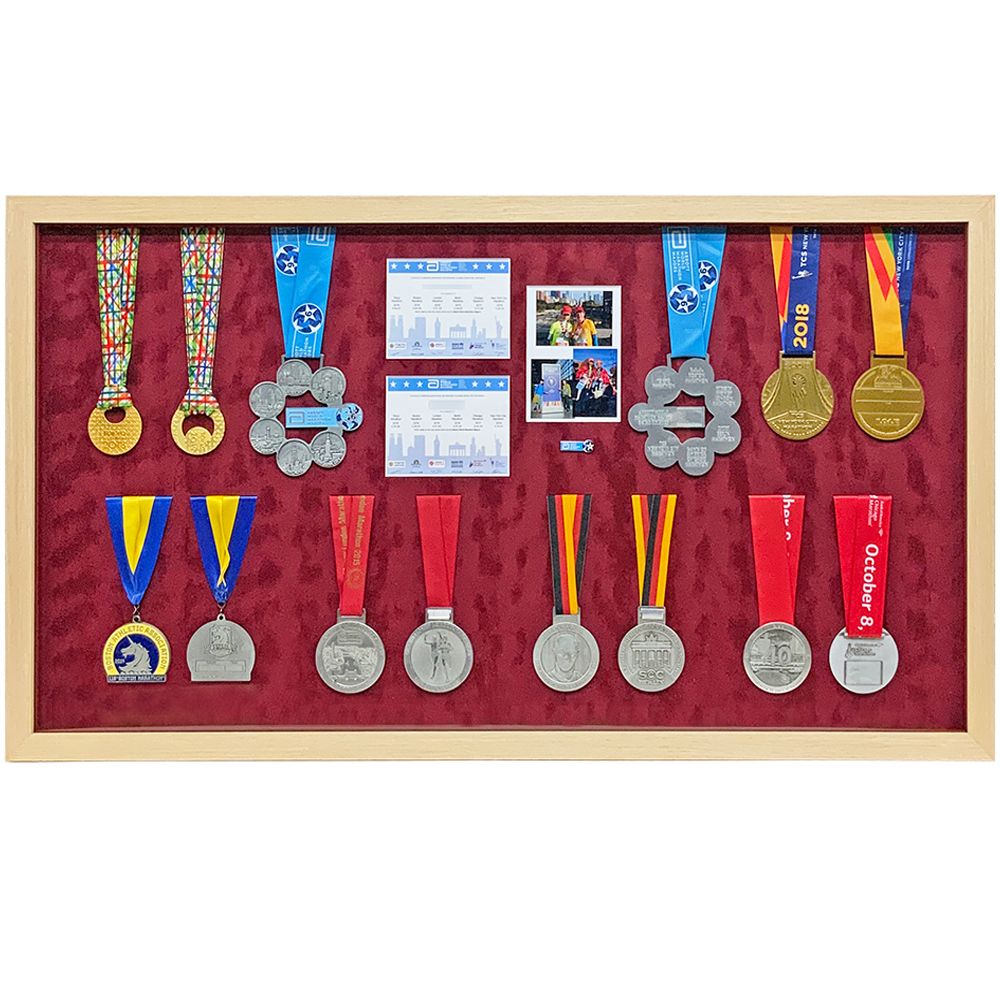 世界最大規模のマラソン大会、東京・ボストン・ロンドン・ベルリン・シカゴ・ニューヨークシティの6大会を制覇。まさにマラソン界のグランドスラムを達成した暁には、Six Star Finisherとして称えられ、各大会での記録が入った名前入りの完走証メダルが授与されます。この[Six Star Finisherメダル]と、[AbbottWMM Six Star完走証]、[六大大会それぞれの完走メダル]を額装しました。世界中のランナーの夢ともいえる、非常に貴重な品物です。 六大大会のメダル、グランドスラム達成のメダル、それぞれが2個セットでの額装です。メダルの同じ面を見せる各メダルの裏表を見せる、豪華な額装になりました。立派なメダルが14個もの額装になりましたので、重量を支えられるよう裏板パネルなども工夫しています。 背景となるマットに切れ込みを入れて、リボンを入れ込んで隠しています。背面に回したリボンでメダルをぶら下げつつ、両面テープを使ってメダル本体を固定しました。メダルは埋め込み加工することもありますが、こちらのメダルは形状や大きさがばらばらのため、埋め込みの加工が困難です。両面テープなどを使うと、額縁から外すことはできなくなってしまいますが、メダル自体の立体感が伝わりやすいメリットもあります。
