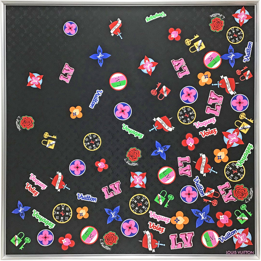 ルイヴィトンにちなんだ、様々なアイコンが散りばめられたスカーフ。アルミ製のすっきりしたフレームで飾りました。色とりどりのアイコンが目を引きますが、背景の黒地部分にもルイヴィトンのモノグラムが透けて見えます。