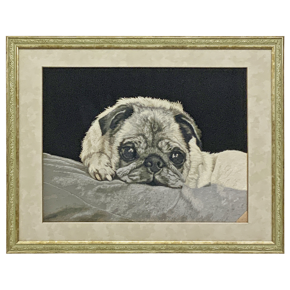 マットはスエード調の布張りマットに、面金加工を施しました。当然ながら刺繍は布地なので、マットも布地で合わせると一体感が出ます。はっきりした色合いのマットでカラーコーディネートを楽しむのも良いですが、こういったモノトーンの刺繍には、一体感のあるコーディネートで渋めに仕上げるのも一興です。華やかなフレームと対比されて、ブルドックの存在感が際立ちました。