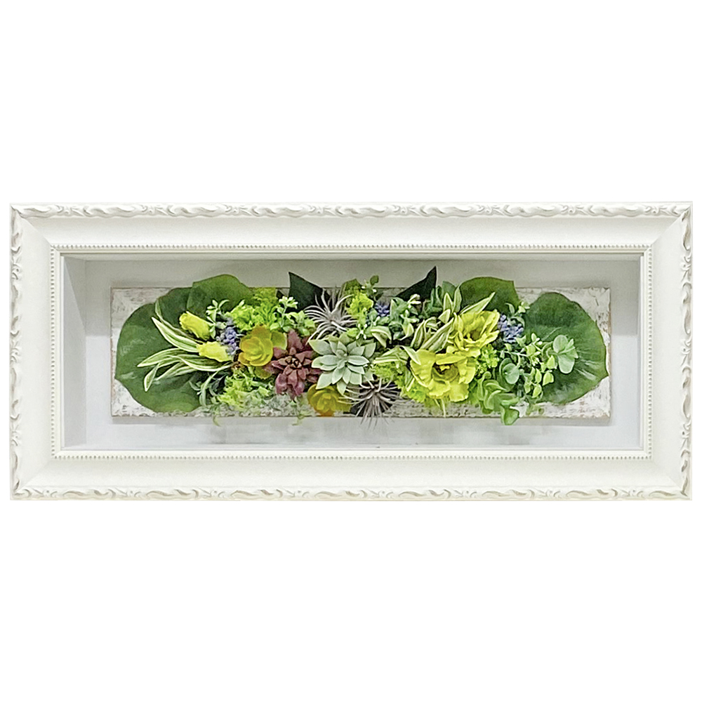 造花の寄せ植えを、ボックス状の器ごと額縁に納めました