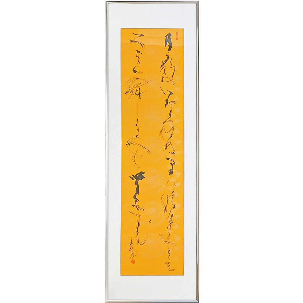 YW24やYW43などの書道額は、額縁内部の布地を豊富に取り揃えております。こちらの額装例では、70:白唐草の布地を選択しました。シルバーのフレームと、控えめな白唐草の模様が合わさって、爽やかでスタイリッシュな仕上がりになっています。作品本紙のオレンジ色が際立つ額装になりました。